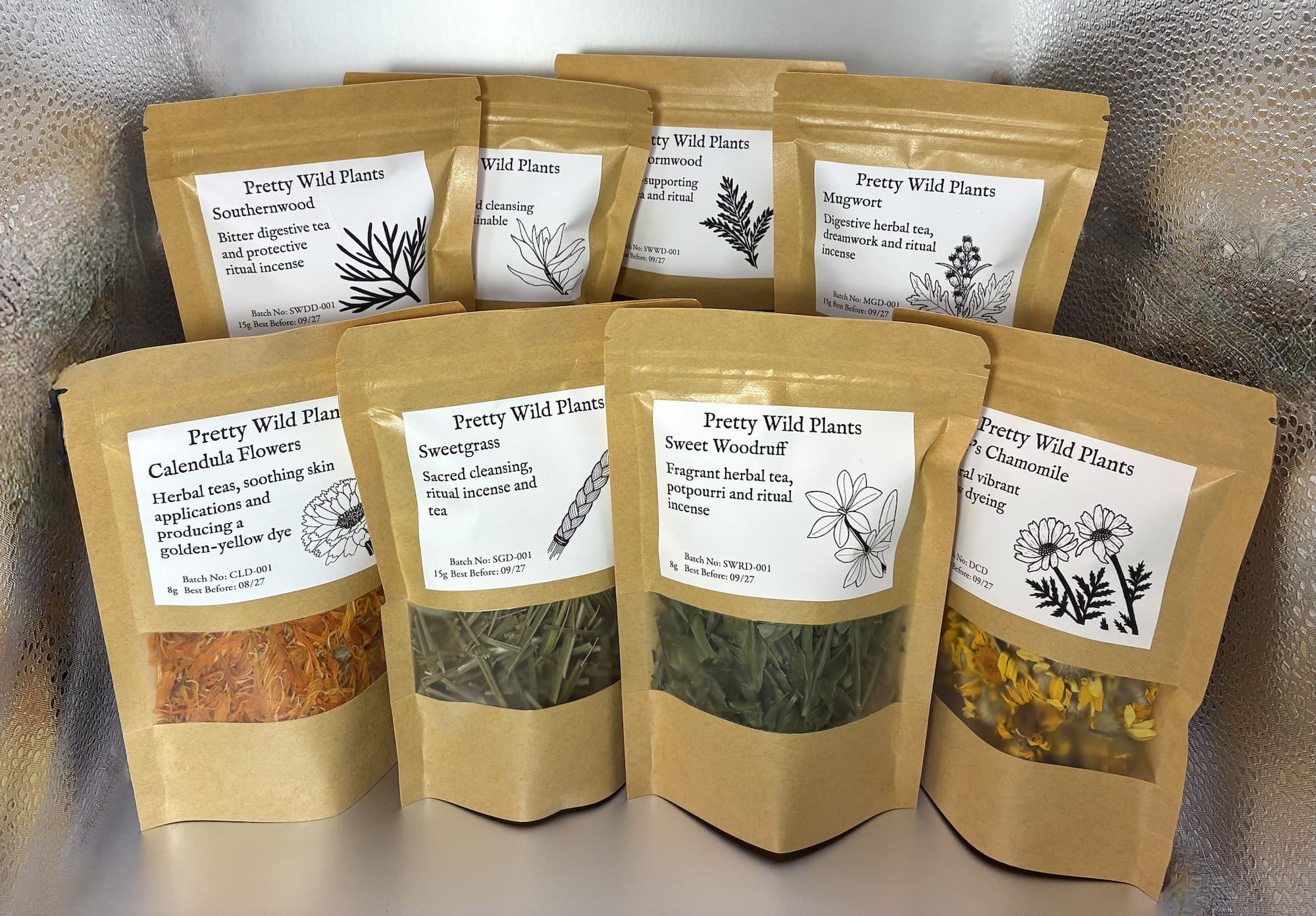 - Dried Herbs: Dittany, Calendula, Mugwort, Mullein, Dyer’s Chamomile, Sagebrush, Sweetgrass, Sweet Wormwood, Sweet Woodruff, and Southernwood
