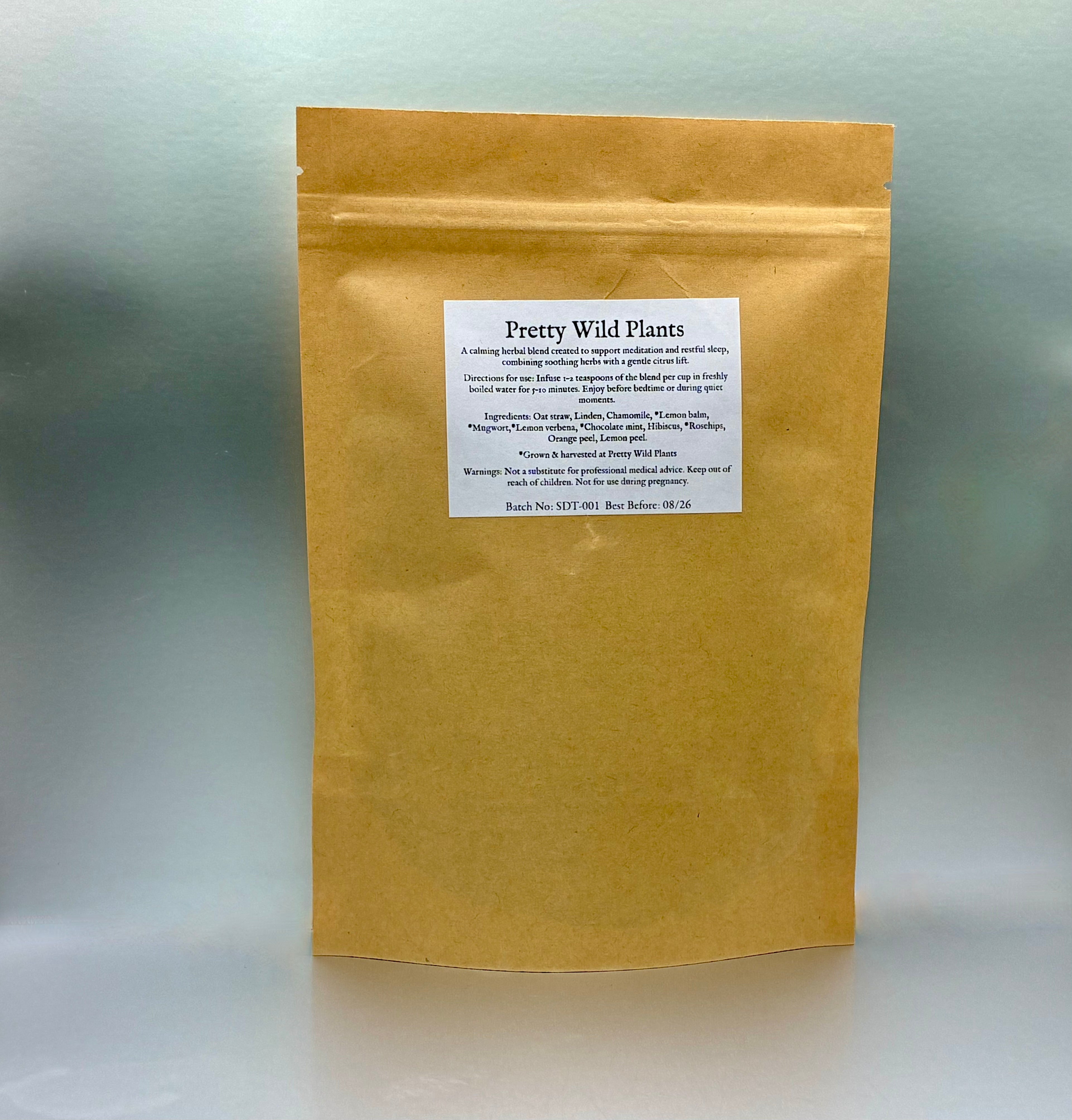 Sweet Dreams Tea is a soothing, aromatic blend of calming herbs created to quiet the mind, ease tension and invite peaceful rest. Handmade in small batches from organically grown and foraged plants, this gentle tea supports relaxation in the evening or during meditation, helping the body and spirit unwind after the day.